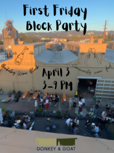 Join us for the very first First Friday Block Party of 2026 featuring over 20 incredible food vendors alongside wines from the Berkeley Wine Block – Hammerling, Tessier, Broc Cellars, and of course, Donkey & Goat.