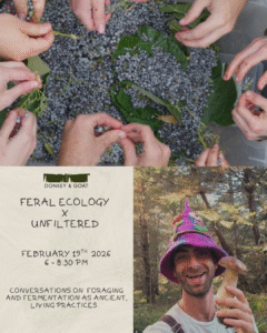 Feral Ecology’s Daniel Goldberg presents a conversation on foraging and fermentation as ancient, living practices for weaving intimacy with land and community. Through experiencing wild ferments and flavors, we’ll explore how curiosity, practice, and a bit of ferality can guide us into not only a deeper relationship with place, but also into care for our bodies, minds, and ecosystems.